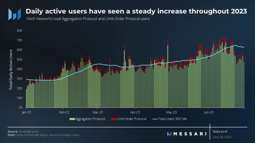 Os usuários ativos diários também tiveram um aumento constante, atingindo um topo de cerca de 65.000 em junho de 2023. O Limit Order Protocol também teve sua base de usuários aumentada de 261.000 no primeiro trimestre para 438.000 no segundo trimestre, o que representa um aumento de cerca de 68% nos trimestres.