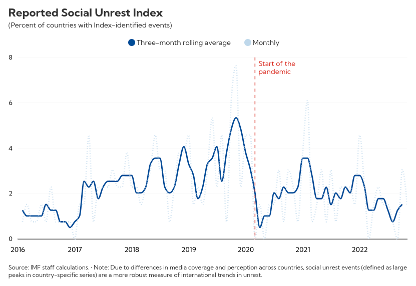 De acordo com a publicação após uma pausa nos protestos populares durante o primeiro ano da pandemia, as pessoas voltaram às ruas. Apesar de vários eventos recentes notáveis, o índice caiu desde então e permanece abaixo dos níveis pré-pandêmicos” .