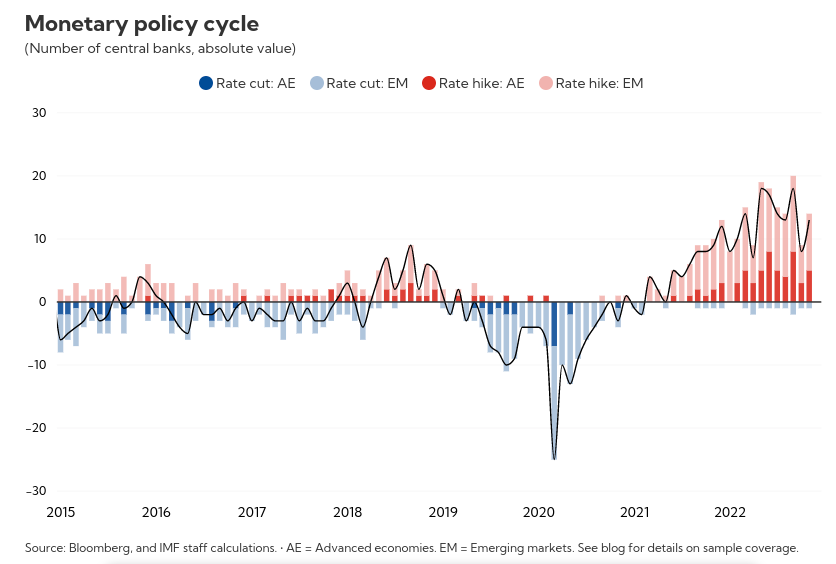 À medida que o ano de 2022 terminava, muitos bancos centrais ainda estavam aumentando as taxas, frisa o Fundo.