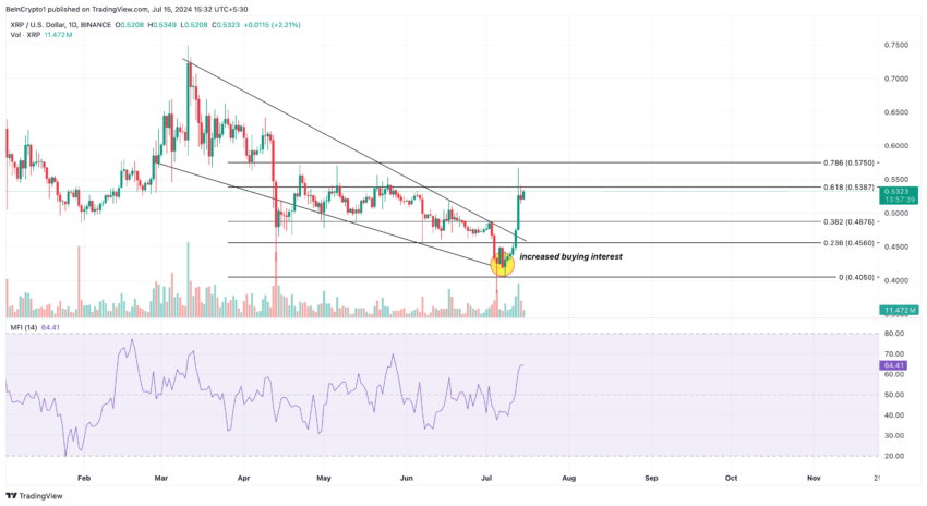 Inicialmente, o XRP encontrou um canal de baixa de vários meses, com linhas de tendência conectando topos e fundos mais baixos. No entanto, a análise mostra que a altcoin explodiu depois que o interesse de compra se intensificou em US$ 0,42. Posteriormente, isso levou a um salto para US$ 0,53.