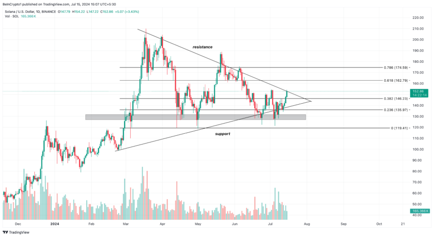 Os topos atuam como resistência, enquanto os fundos atuam como suporte. Apesar disso, o preço da SOL está procurando romper o triângulo. Se isso acontecer, a Solana sairá da fase de consolidação e se encaminhará para um grande rompimento.