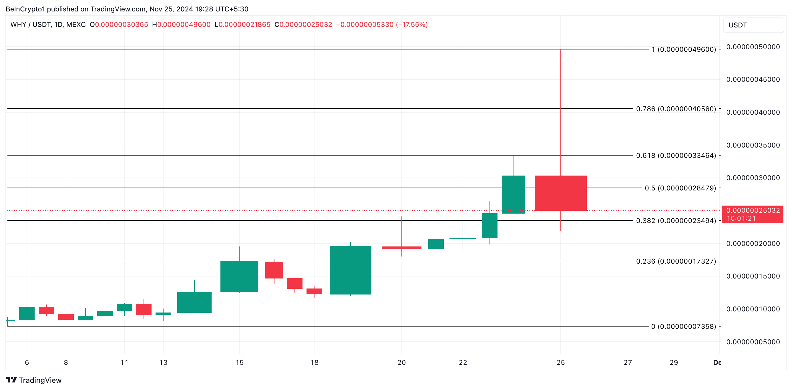 A WHY atualmente é negociada a US$ 0,00000025. Ela atingiu um recorde histórico de US$ 0,00000049 hoje e testemunhou uma retração de 40%. Isso se deve ao aumento na atividade de venda, que pressionou seu preço. No gráfico diário, o preço da WHY agora caiu 11%. Se essa queda persistir, pode testar o suporte crítico de US$ 0,00000017.