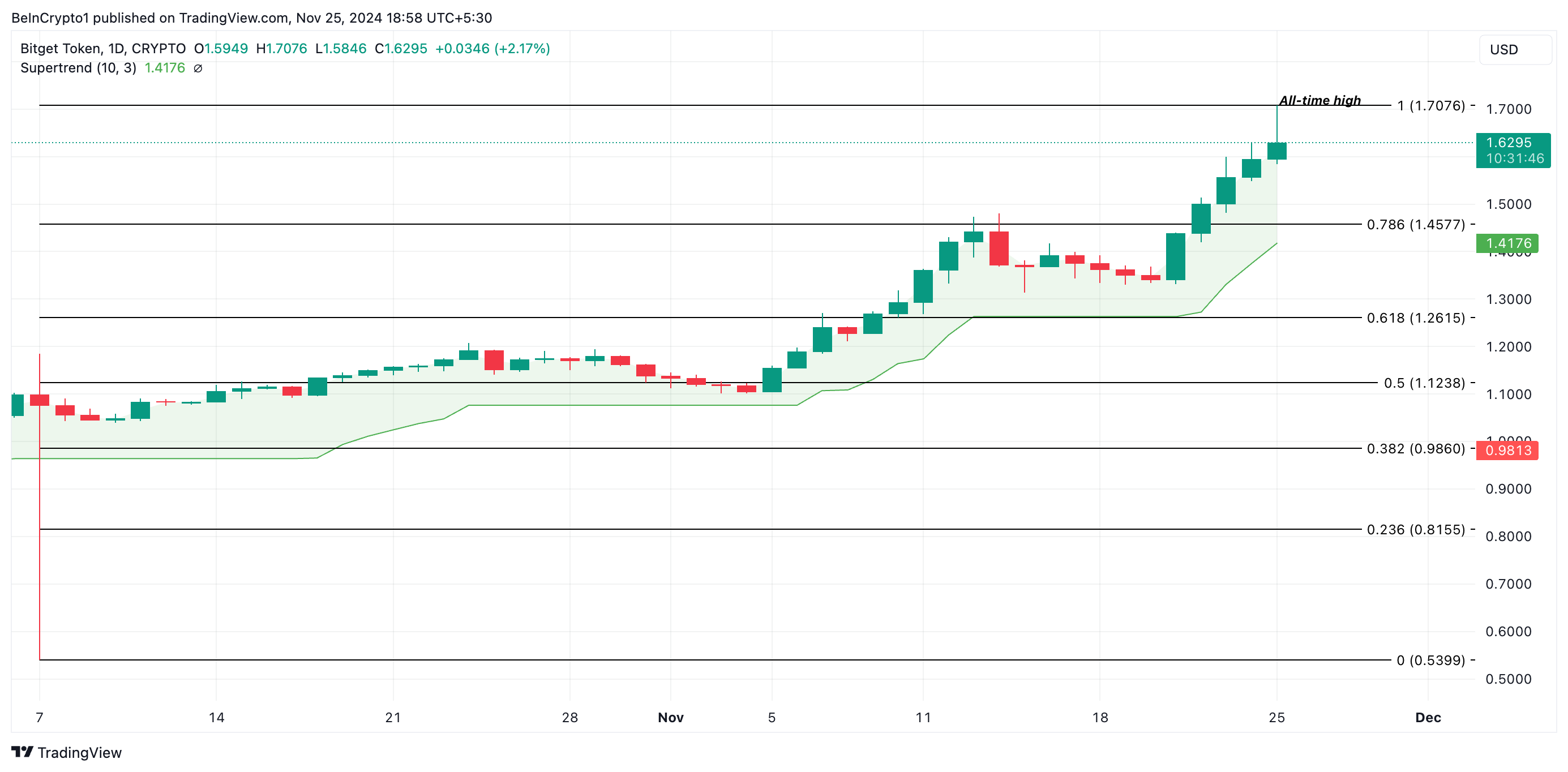 O recorde histórico de hoje é o quinto em sete dias. Isso reflete o aumento constante na demanda pela altcoin impulsionado pela confiança dos investidores. A configuração do indicador Super Trend da BGB em seu gráfico diário confirma essa perspectiva otimista.