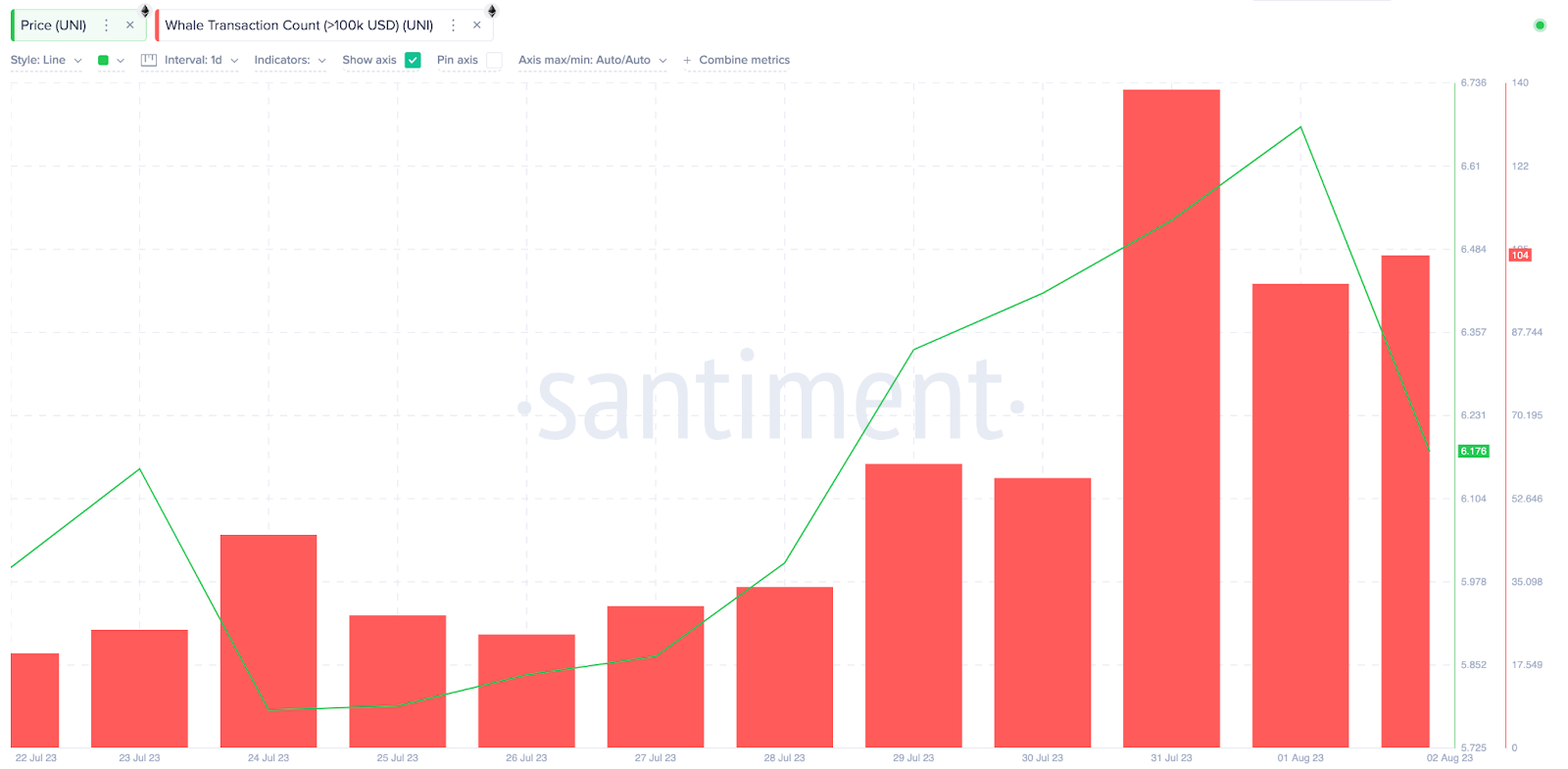 Notavelmente, as transações de grandes endereços envolvendo a UNI dispararam cerca de 600% entre 22 e 31 de julho. Isso sugere que o aumento da atividade comercial de baleias é um dos principais fatores por trás da valorização do token.