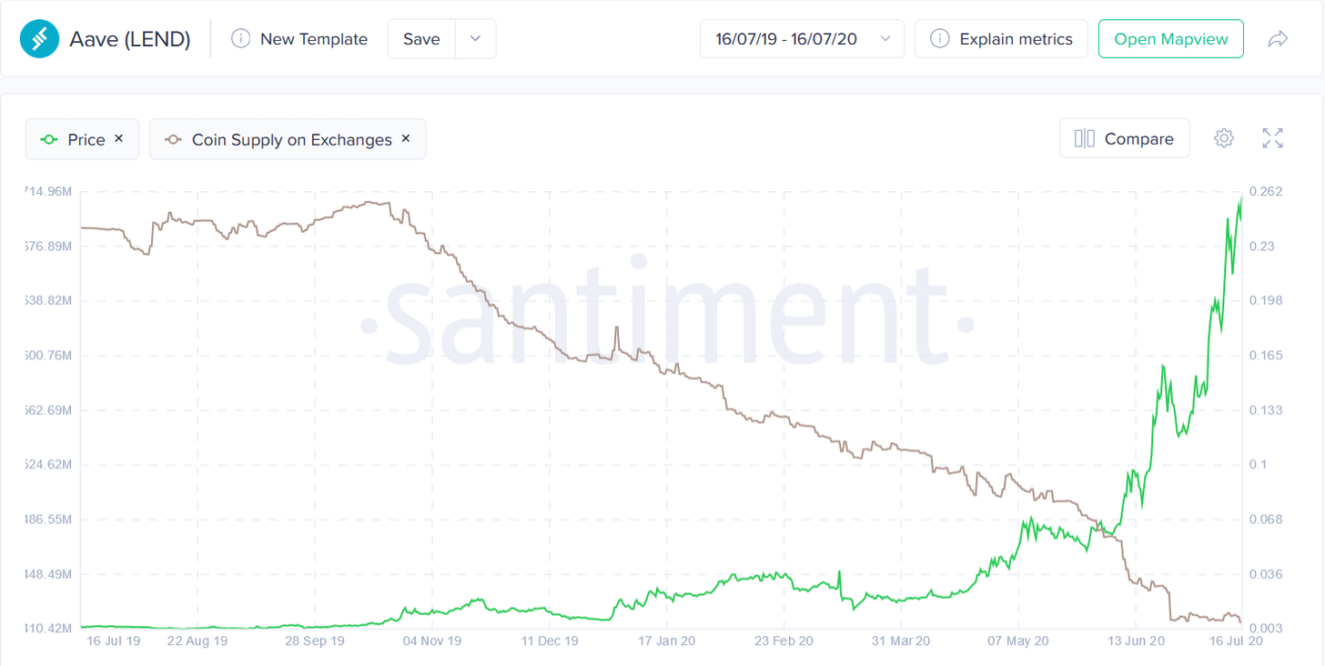 Somente nos últimos 30 dias, enquanto os preços sobem, 179 milhões de REN foram retirados de exchanges, queda de 8,5%. Já a LEND tem menos 5,1% disponível no mercado.