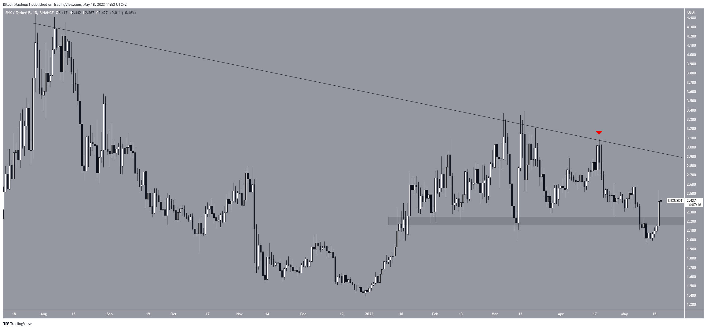 O preço do SNX caiu sob uma linha de tendência de baixa desde setembro de 2022. Mais recentemente, a linha causou rejeição em abril de 2023 (ícone vermelho), causando o atual movimento de queda.