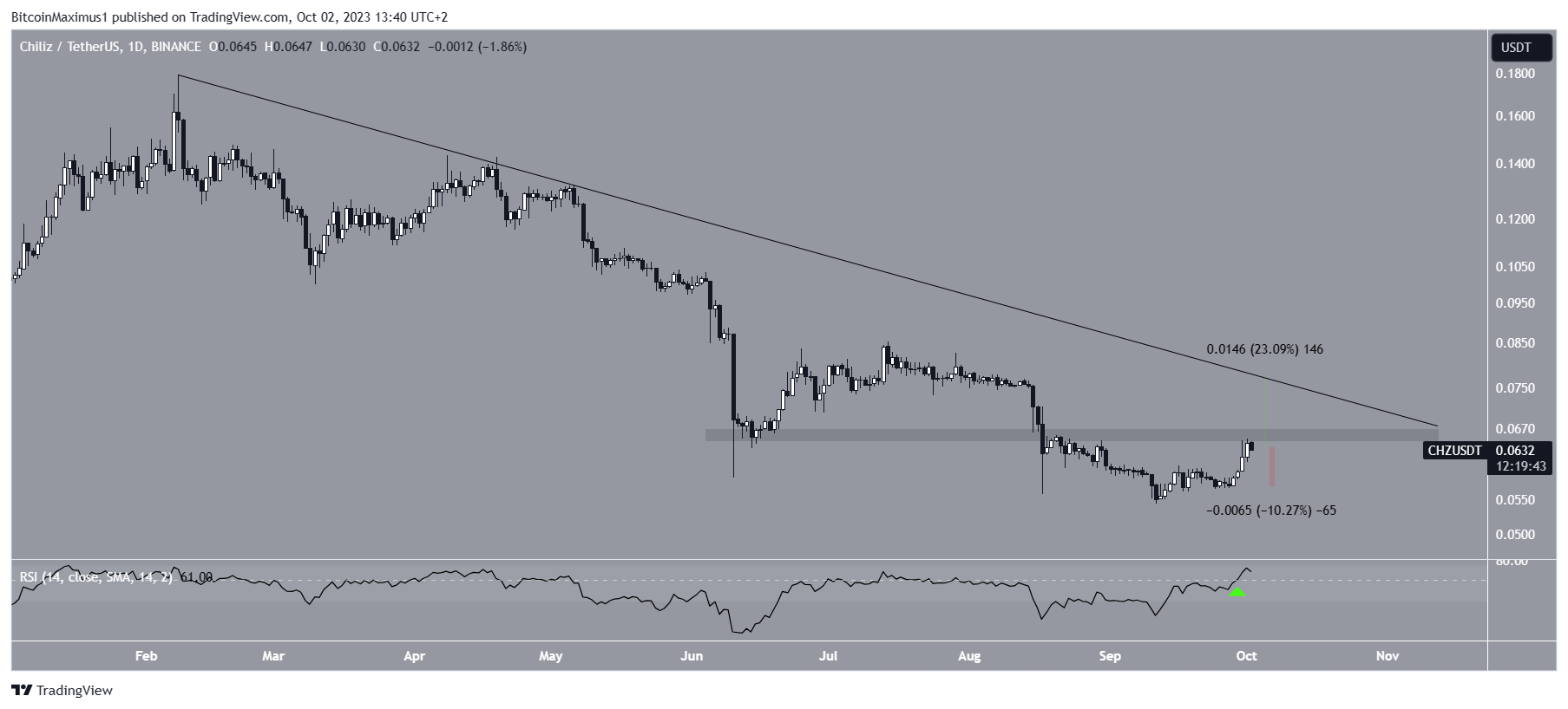 Tal como acontece com a APE, a CHZ está abaixo de uma linha de tendência de baixa desde o início do ano. A queda culminou com uma mínima de US$ 0,055 em 11 de setembro. O preço saltou depois e vem subindo desde então.
