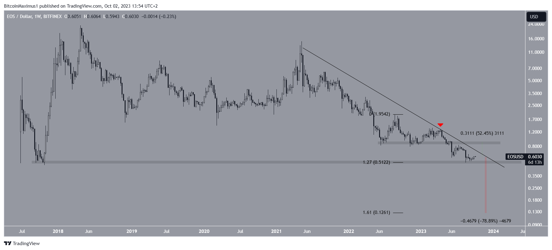 A EOS está abaixo de uma linha de tendência de baixa desde junho de 2021. Mais recentemente, foi rejeitada pela linha em abril de 2023.