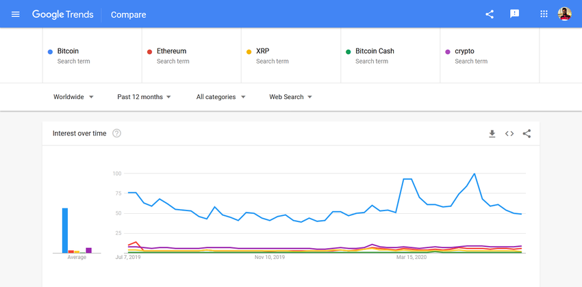 Considere a figura abaixo. O Bitcoin é várias ordens de magnitude mais popular que as principais altcoins, incluindo termos da indústria como “crypto”.