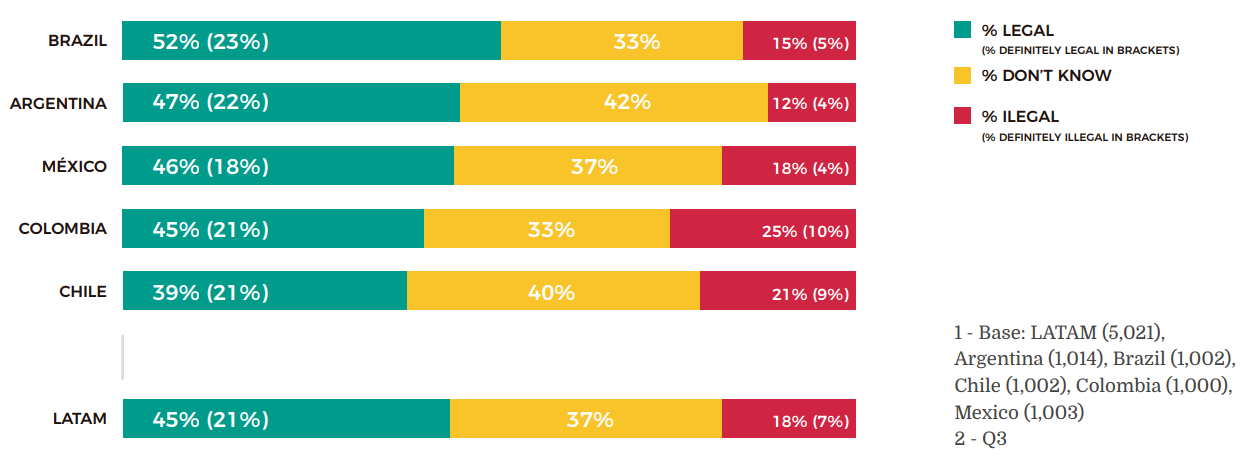 Apesar disso, o Brasil foi o único país da América Latina onde mais da metade das pessoas (52%) deram a resposta correta de que usar criptomoedas não infringe qualquer lei da legislação brasileira.