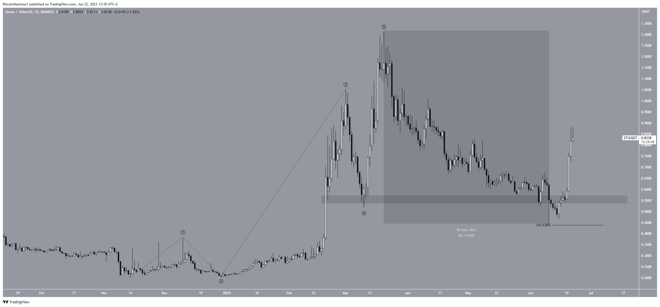 A contagem de ondas suporta o aumento contínuo. Desde novembro de 2022, o STX completou um aumento de cinco ondas. Então, a queda de 82 dias que se seguiu se assemelha a uma correção completa.