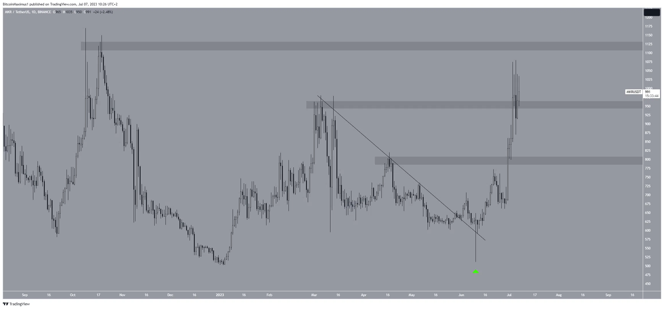A MKR subiu desde que saiu de uma linha de resistência descendente e a validou como suporte em 10 de junho. O ativo criou um fundo mais alto em 1º de julho e acelerou sua taxa de aumento posteriormente. Em 5 de julho, a MKR atingiu um novo topo anual de US$ 1.080.