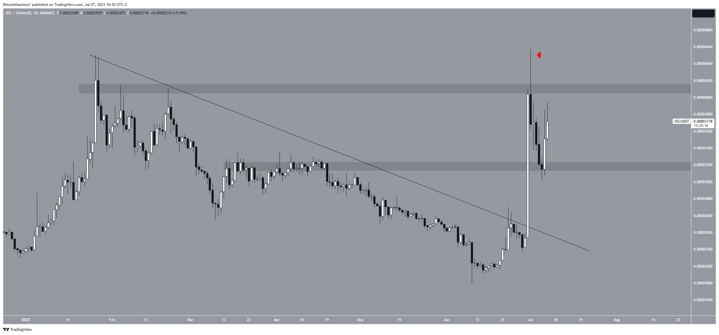 Embora o XEC tenha subido após a rejeição, ele ainda era negociado abaixo da área de US$ 0,000041.