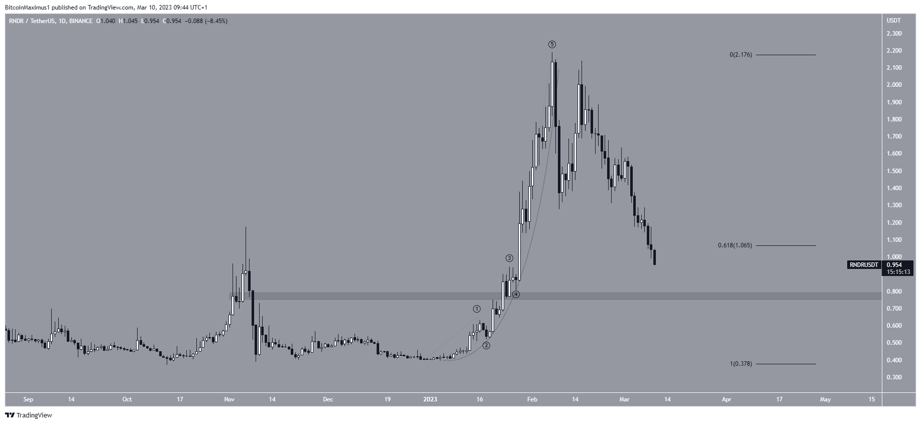O RNDR caiu desde 7 de fevereiro, quando atingiu uma alta de US$ 2,19. Dessa forma, criando um topo mais baixo em 16 de fevereiro e acelerando sua taxa de queda.