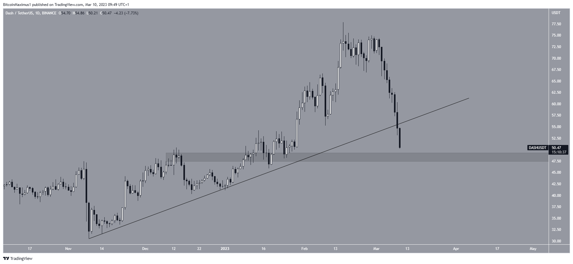 A DASH caiu desde que atingiu a máxima de US$ 77,90 em 16 de fevereiro. O ativo criou um topo mais baixo no início de março e acelerou sua taxa de queda posteriormente. Em 9 de março, a DASH caiu de uma linha de suporte ascendente.