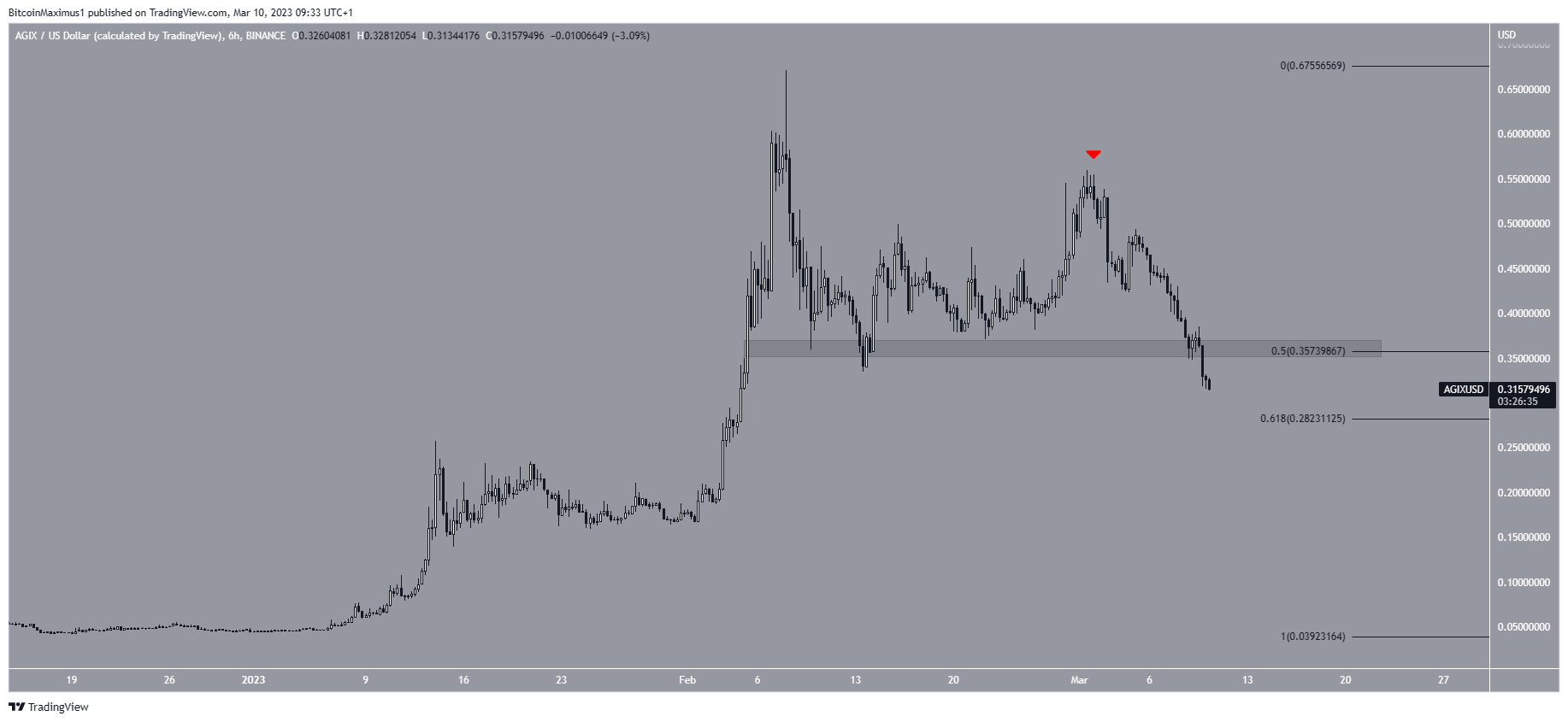 A AGIX caiu desde que atingiu uma alta de US$ 0,67 em 8 de fevereiro. Como resultado, ela criou um top mais baixo (ícone vermelho) em 1º de março e retomou sua queda. Em 9 de março, perdeu o nível de suporte de retração 0,5 de Fibonacci em US$ 0,36.