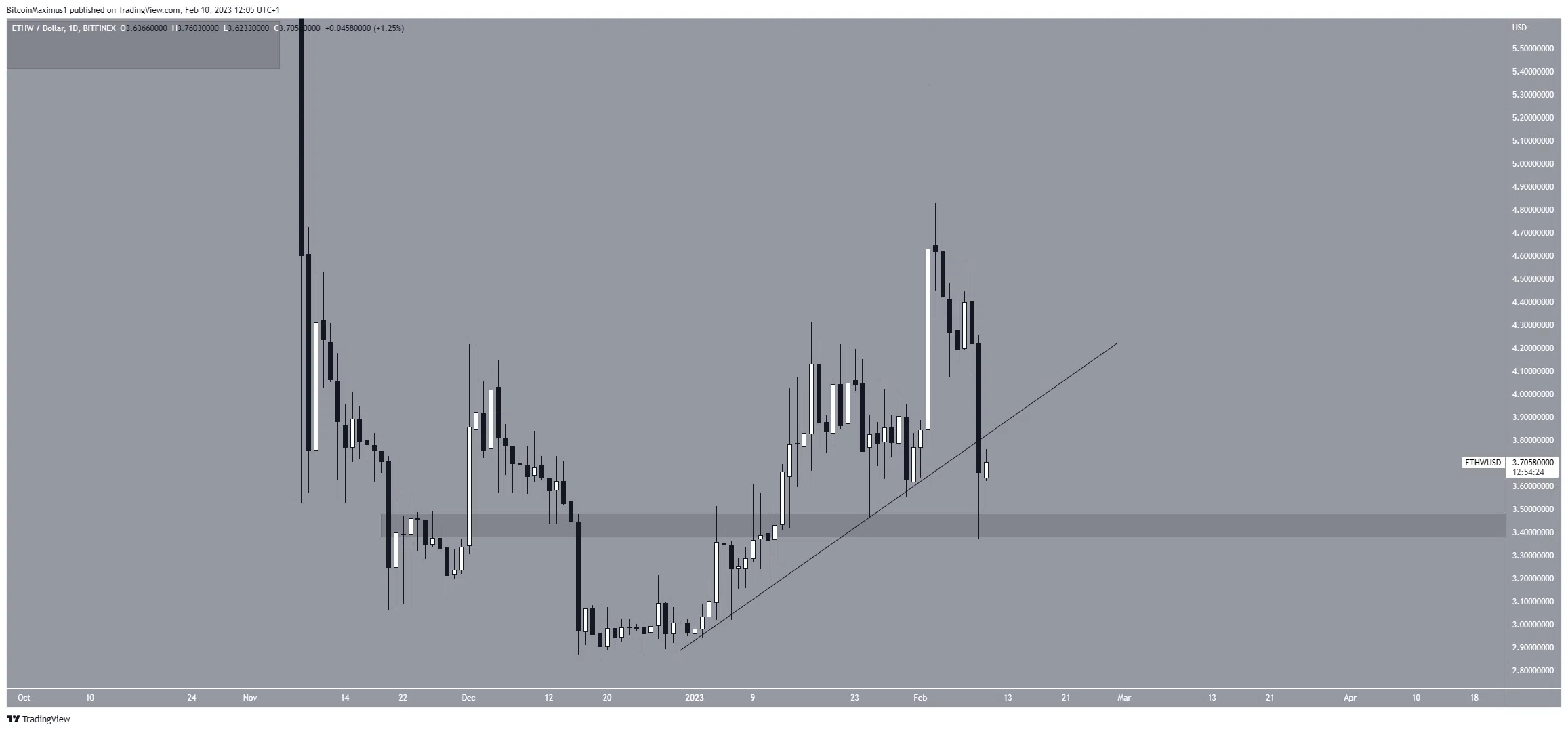 No entanto, seu preço caiu logo depois e rompeu a linha de tendência em 9 de fevereiro. Se o movimento de queda continuar, o ETHW pode cair para US$ 3,40. Por outro lado, se a tendência for revertida, a linha de suporte anterior em US$ 4 pode fornecer resistência.