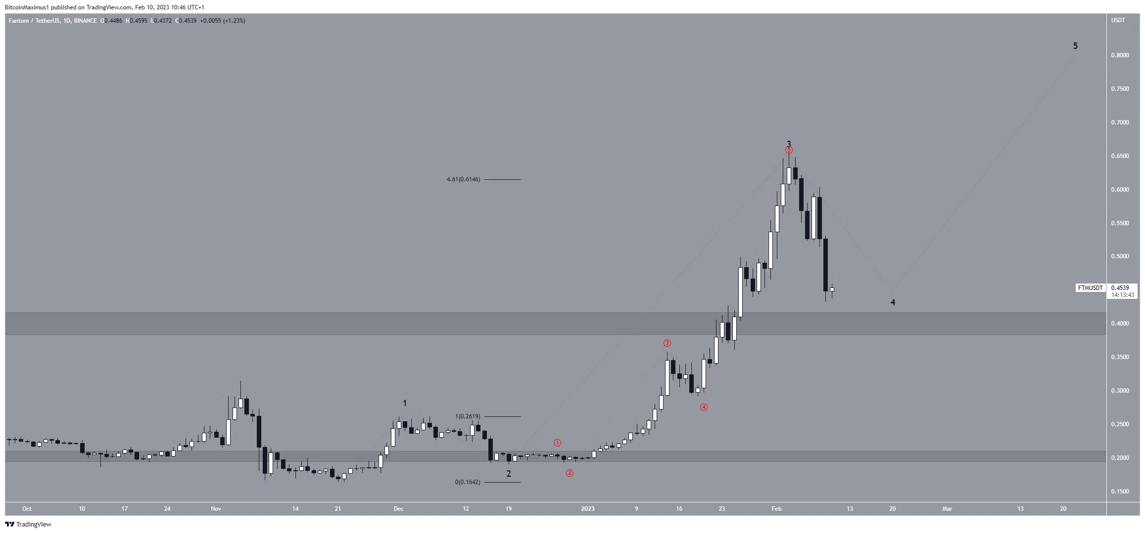 A FTM subiu rapidamente desde novembro de 2022. O movimento levou a uma máxima de US$ 0,66 em 3 de fevereiro. A alta atingiu a extensão 4,61 de Fibonacci da onda um.