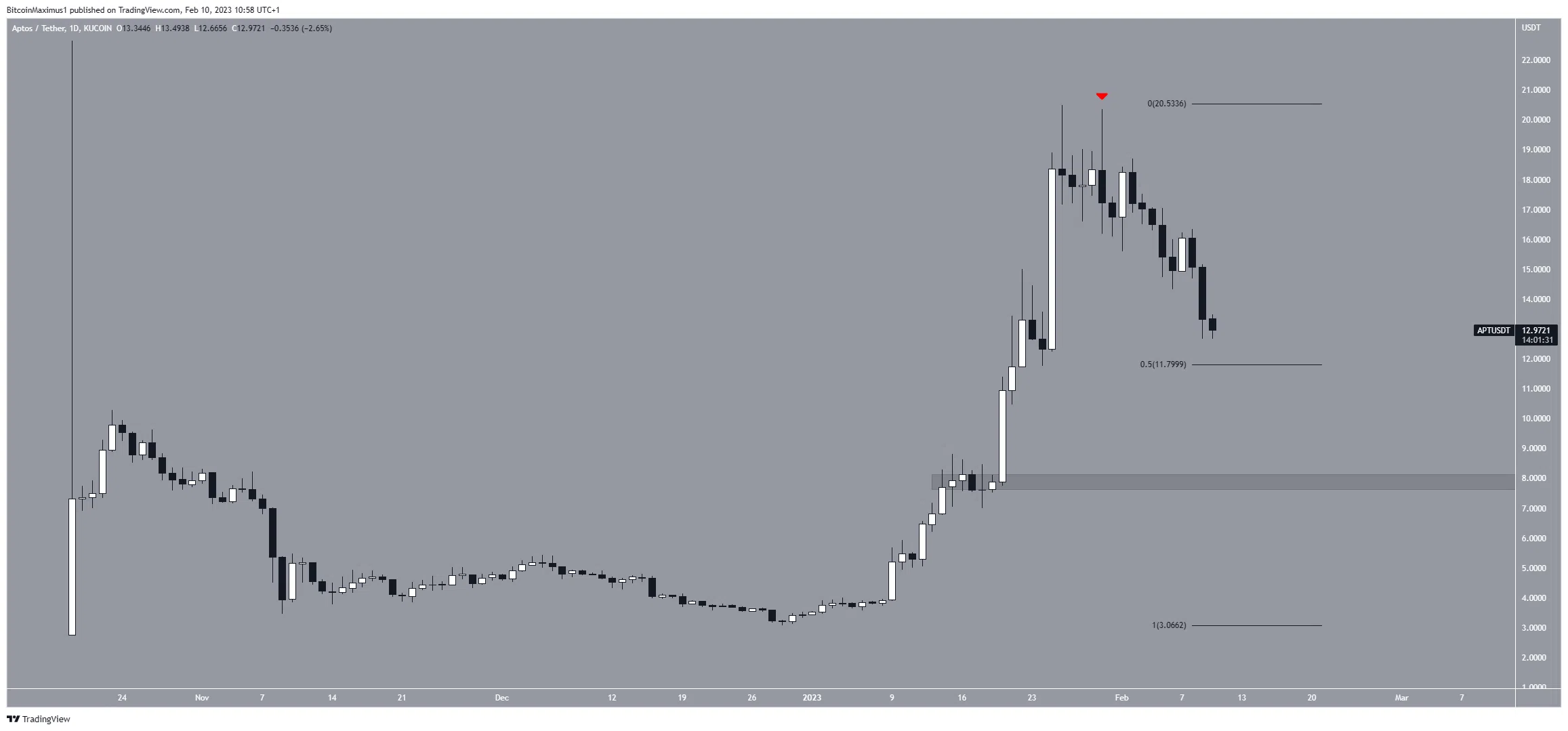 O Aptos é negociado perto do nível de retração 0,5 de Fibonacci em US$ 11,80. Espera-se um salto assim que chegar lá. Se, no entanto, fechar abaixo da área de suporte de US$ 11,80, poderá cair para US$ 7.