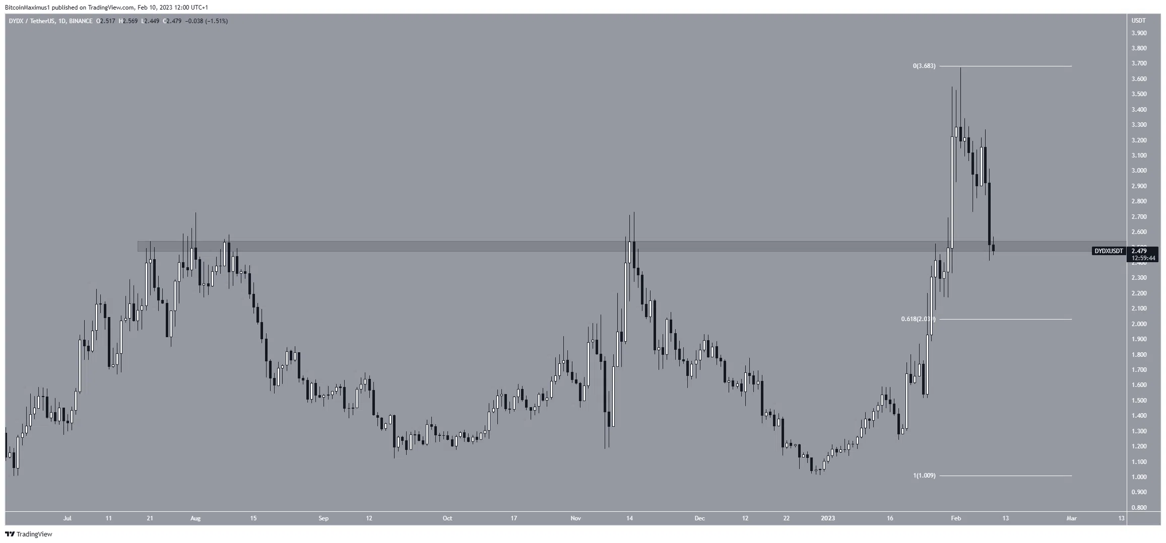 A DYDX caiu desde que atingiu uma alta de US$ 3,67 no dia 2 de fevereiro. O movimento levou seu preço para dentro da área de suporte horizontal de US$ 2,50.