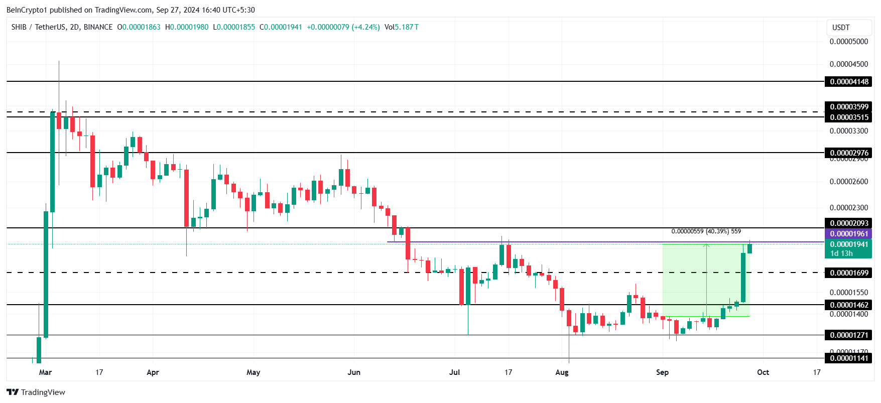 A segunda maior memecoin parece estar se preparando para uma quebra da barreira de três meses e meio. O preço do Shiba Inu está atualmente testando a resistência local em US$ 0,00001961.