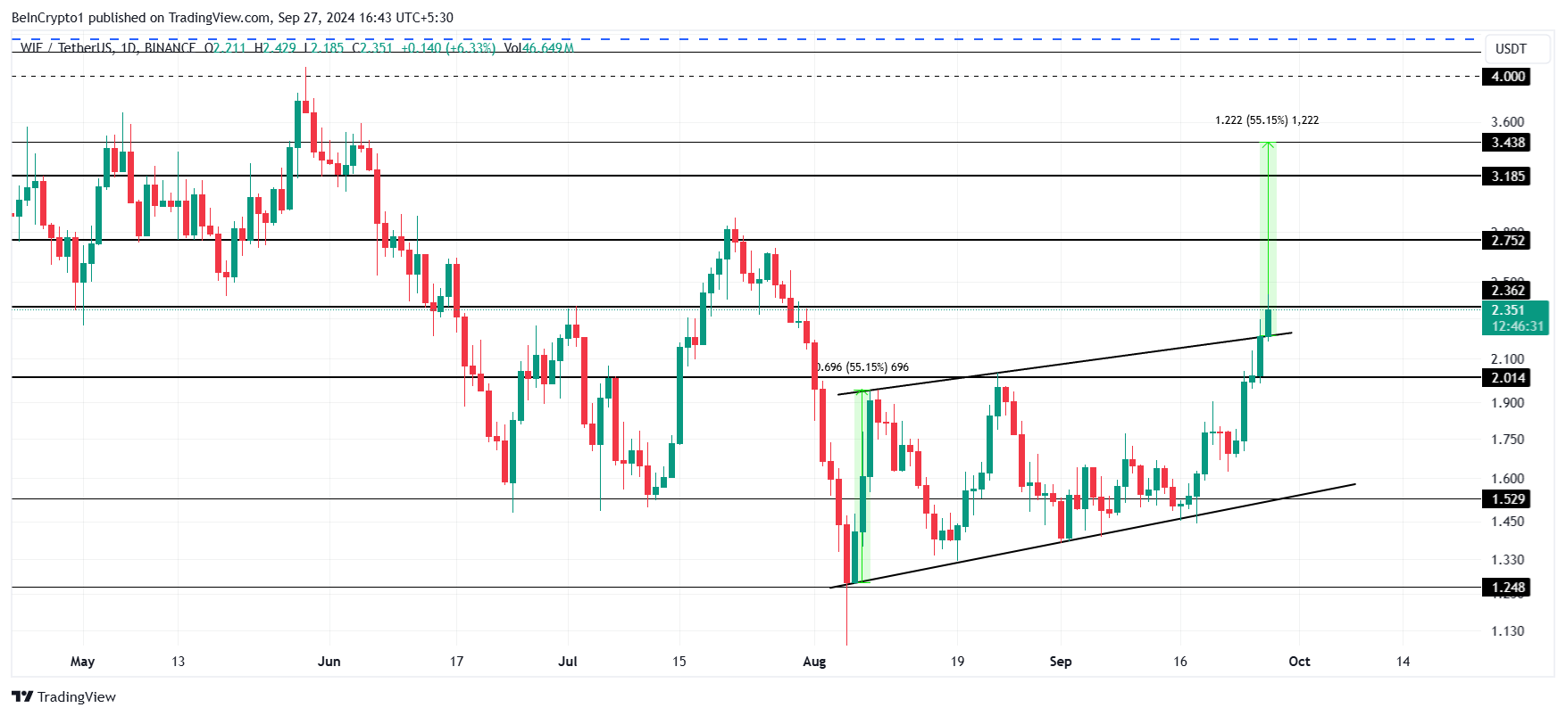 O preço do WIF está visando uma possível alta de 55% no próximo mês, à medida que sai de uma cunha ascendente. O padrão otimista sugere uma elevação para US$ 3,43 nas próximas semanas para dogwifhat.