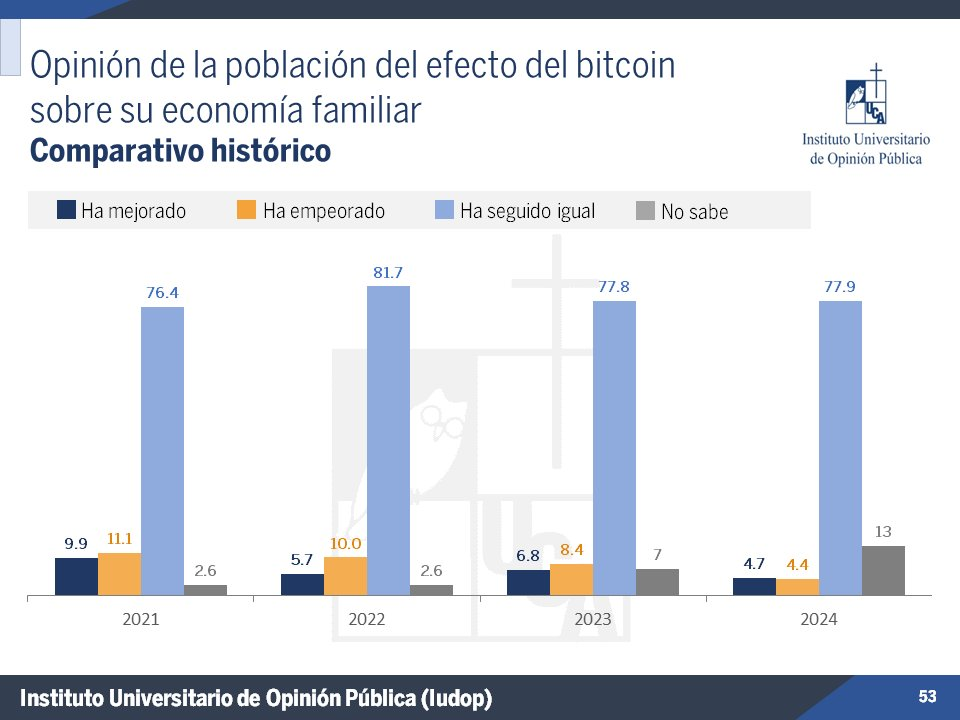 Dados da última pesquisa do Instituto Universitário de Opinião Pública (Iudop) da Universidade Centro-Americana (UCA) revelaram que 56,4% dos salvadorenhos acreditam que o país “permaneceu o mesmo” economicamente com o Bitcoin como moeda legal no último ano. Apenas 13,3% dos cidadãos de El Salvador acreditam que o país melhorou com o Bitcoin em 2024.