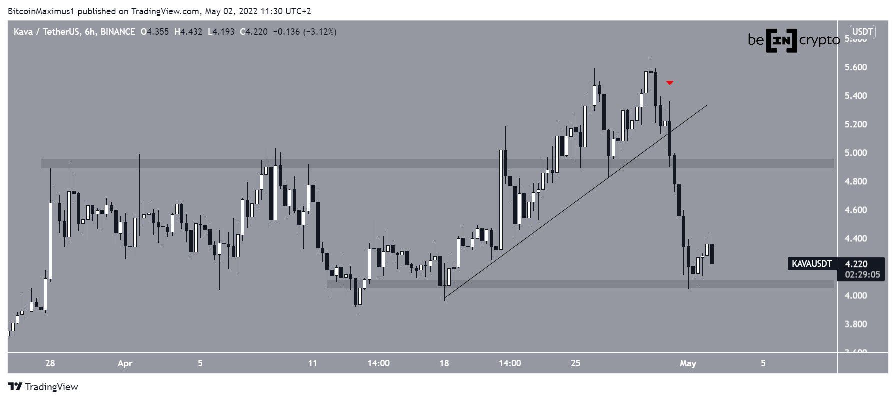 Quanto ao movimento de preços, o KAVA está em tendência de baixa desde o rompimento de uma linha de tendência de alta em 30 de abril (ícone vermelho). Embora tenha saltado na área de suporte de US$ 4,07, o token não está mostrando nenhum sinal de alta.