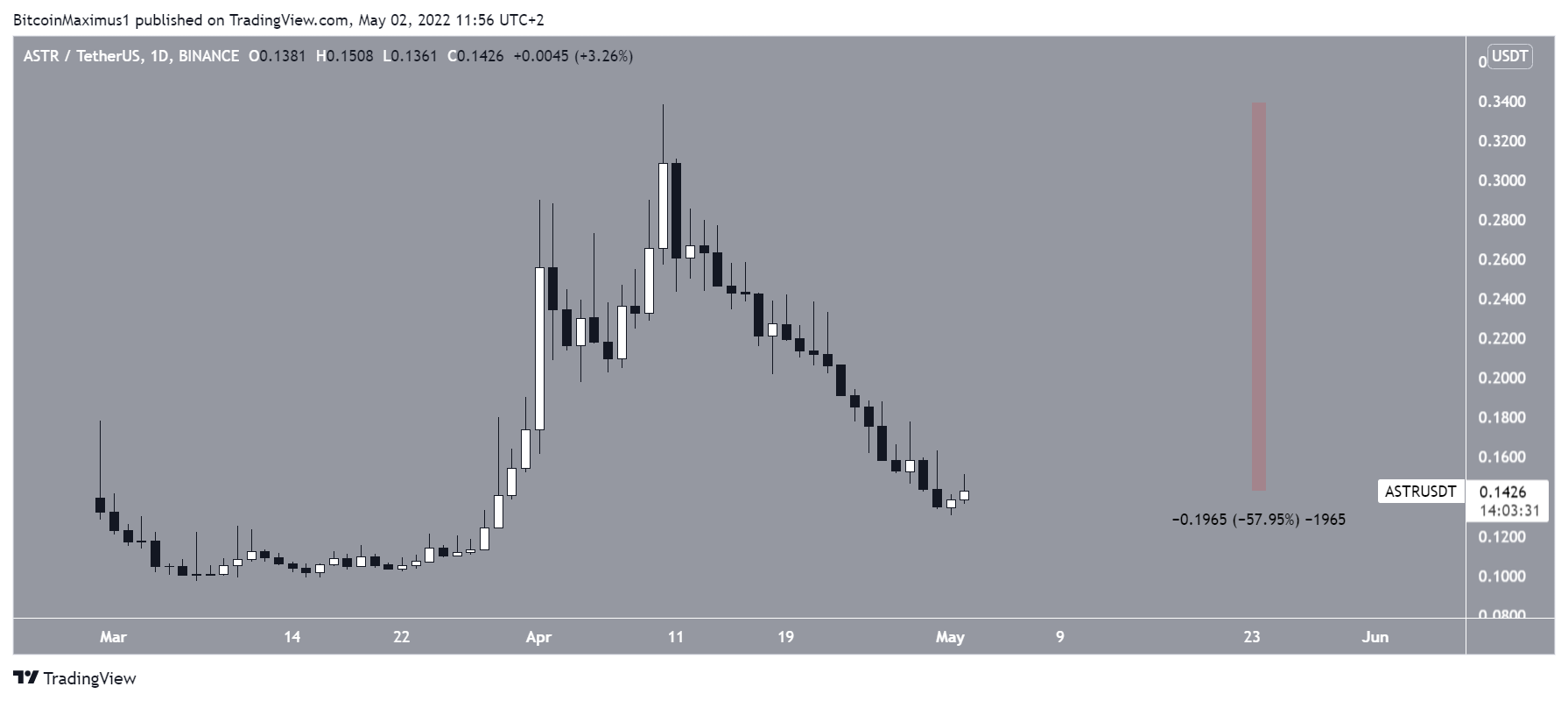 No entanto, o token ASTR vem caindo desde que atingiu o preço recorde de US$ 0,338 em 10 de abril. Até agora, o ativo acumula uma desvalorização de 58%, sem apresentar sinais de reversão de alta.