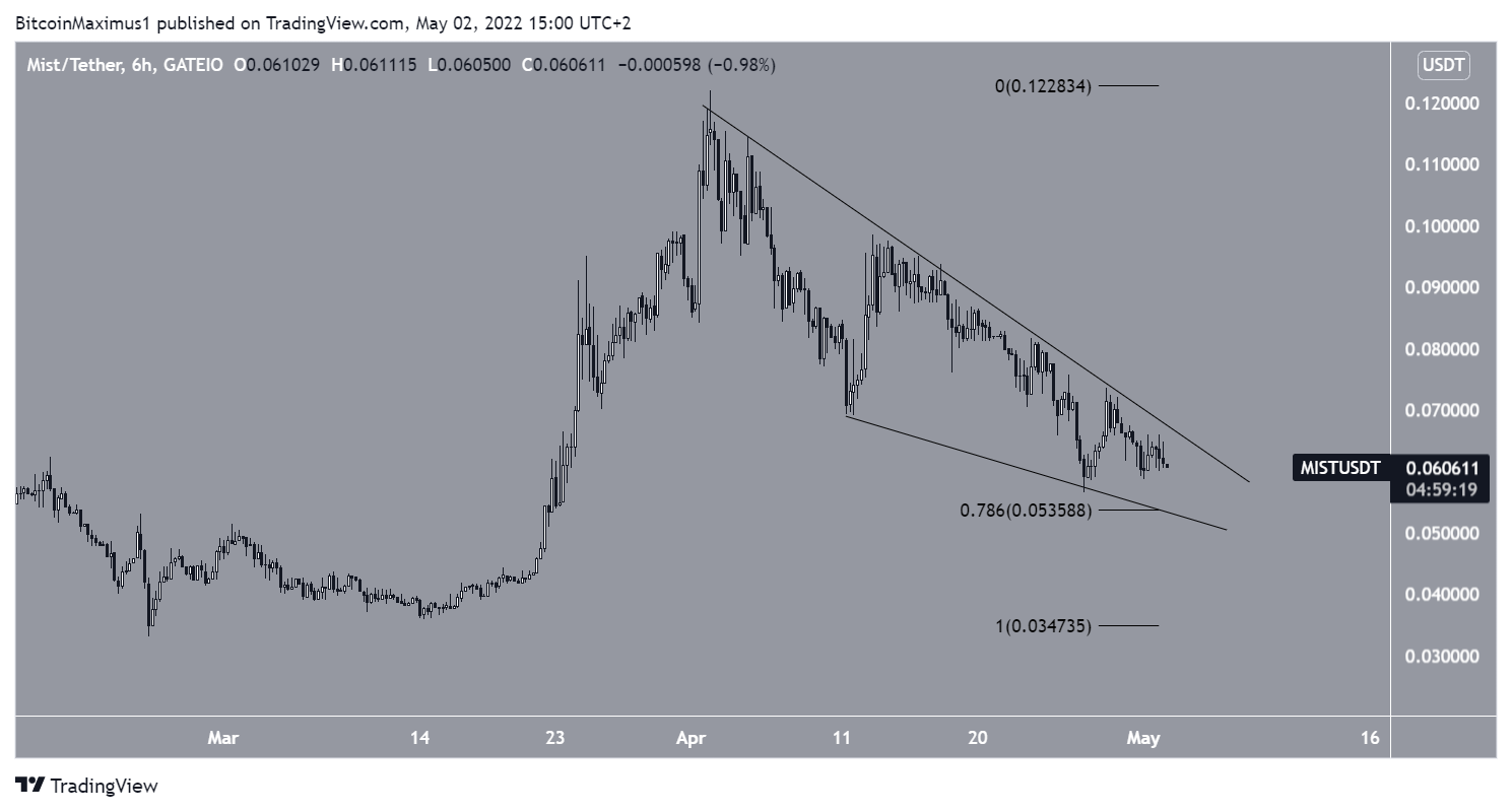 O preço do token MIST vem caindo dentro de uma cunha de baixa. A cunha é considerada um padrão de alta, o que significa que um rompimento desse padrão gráfico seria provável.