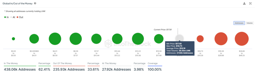 A Chainlink, negociada a US$ 17,80 atualmente, está testando o suporte local de US$ 17,85, cuja recuperação empurraria a altcoin acima da resistência de US$ 18,73. À medida que o montante mencionado acima se tornar lucrativo, o preço deve experimentar um aumento adicional.