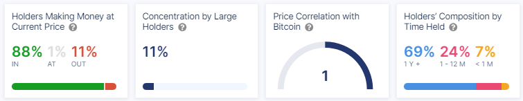 A análise dos dados do site IntoTheBlock mostra que 88% de todos os detentores de Bitcoin registram lucros não realizados. O indicador contabiliza todos os endereços de carteira que compraram BTC a preços inferiores ao valor atual de mercado.