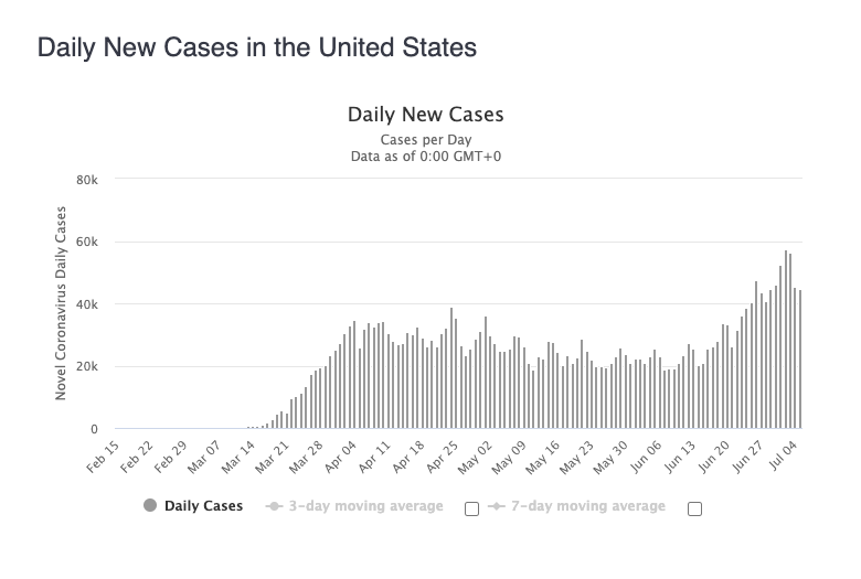 A manifestação mais aparente desse sentimento está nos Estados Unidos. O vírus ainda parece estar correndo solto com o aumento diário de casos em julho.