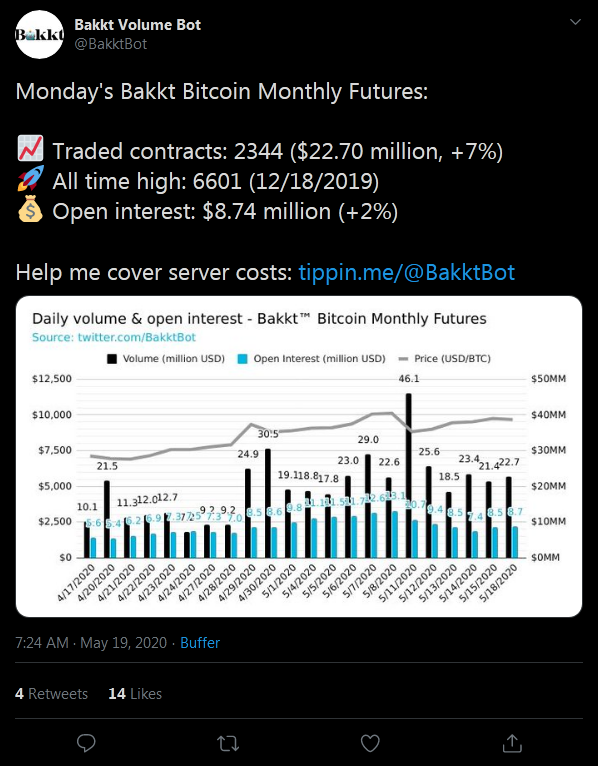 Segundo o @BakktBot – um bot do Twitter que rastreia produto futuros de Bitcoin da Bakkt– o volume de negociação até o momento desta publicação ficou em 553 BTC (cerca de US $ 5,35 milhões). O interesse em aberto nos últimos 30 dias é de US $ 8,74 milhões.