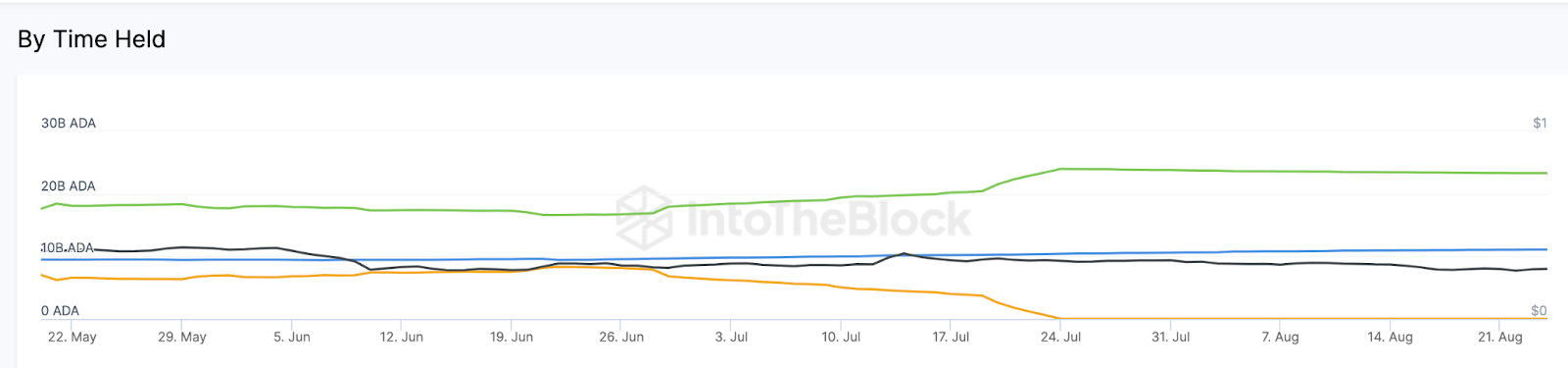 No início de julho, apenas 9,69 bilhões de moedas ADA estavam em endereços de carteiras de longa data. Mas em 24 de agosto, esse número aumentou para 11,04 bilhões de ADA.