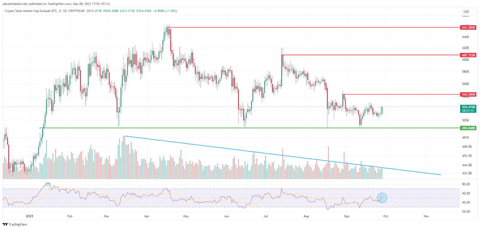 Por outro lado, o principal suporte permanece na área de 494 mil milhões de dólares (linha verde). Sua perda pode levar a um novo teste do fundo do final de 2022, de US$ 437 bilhões.