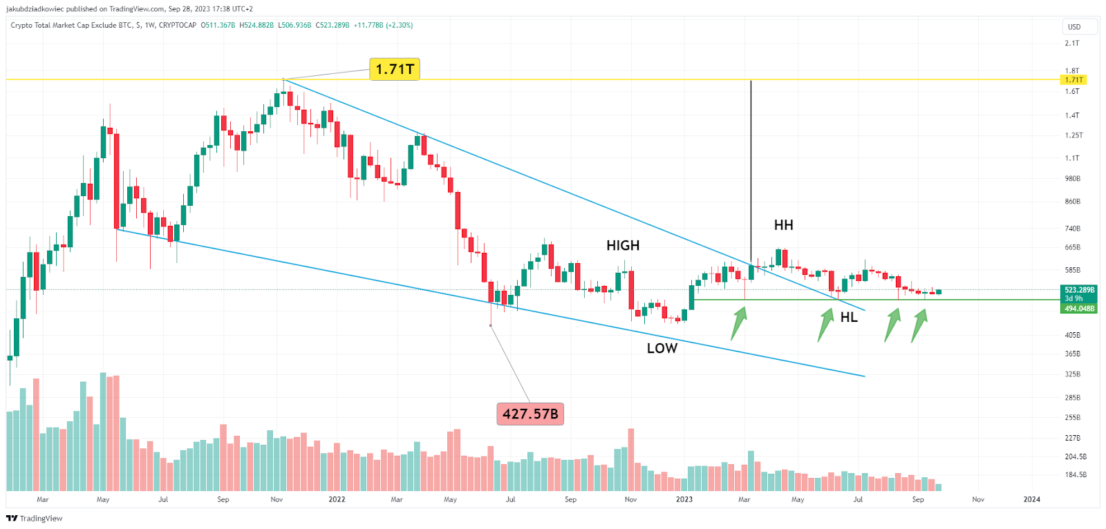 Desde o início de 2023, o gráfico da ALTCAP parece formar uma estrutura de alta. Isso é evidenciado pela primeira máxima mais alta (HH) e mínima mais alta (HL) em relação aos níveis de capitalização das altcoins que caíram no final de 2022.