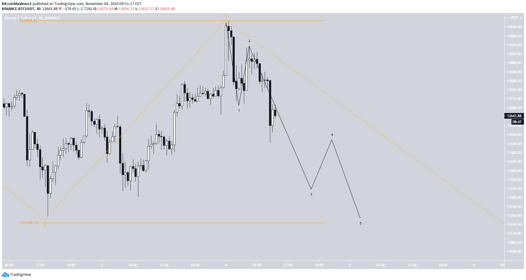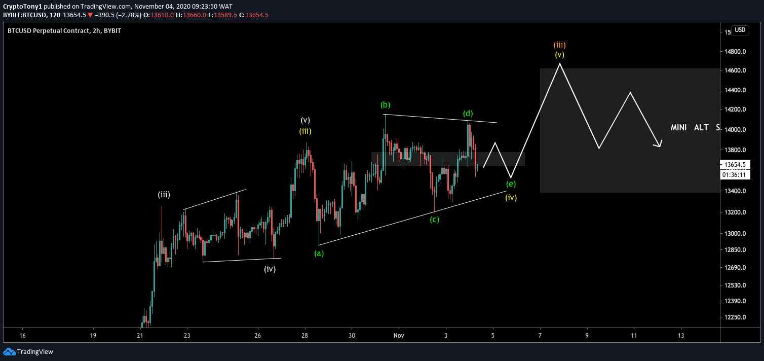 Uma queda abaixo da onda C em $ 13.195 invalidaria o cenário do triângulo, indicando que a contagem correta é a correção complexa da seção anterior.