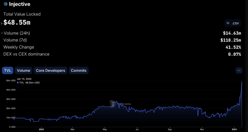 O valor total bloqueado (TVL) no mercado financeiro descentralizado da Injective cresceu impressionantes 42%, para US$ 49 milhões nas últimas 24 horas. Dojoswap, uma exchange descentralizada na rede, viu uma entrada de US$ 27 milhões.