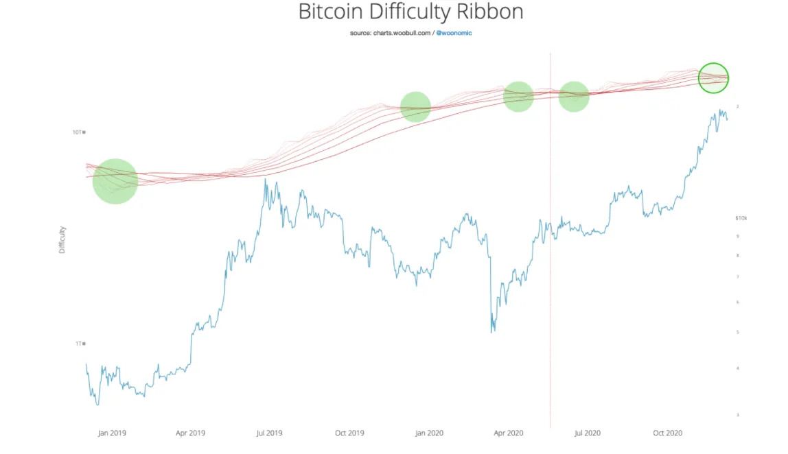 A empresa também analisou a fita de dificuldade do Bitcoin (Bitcoin’s Difficulty Ribbon). Esta é uma métrica usada pelo analista Willy Woo que, conforme a Glassnode, é um indicador confiável de médio prazo.