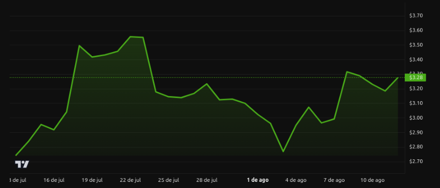Se a pressão de compra for mantida e este nível for rompido, o token pode se dirigir para US$ 3,35–US$ 3,40. No entanto, se ocorrer realização de lucros, os suportes imediatos estão localizados em US$ 3,25 e US$ 3,22.