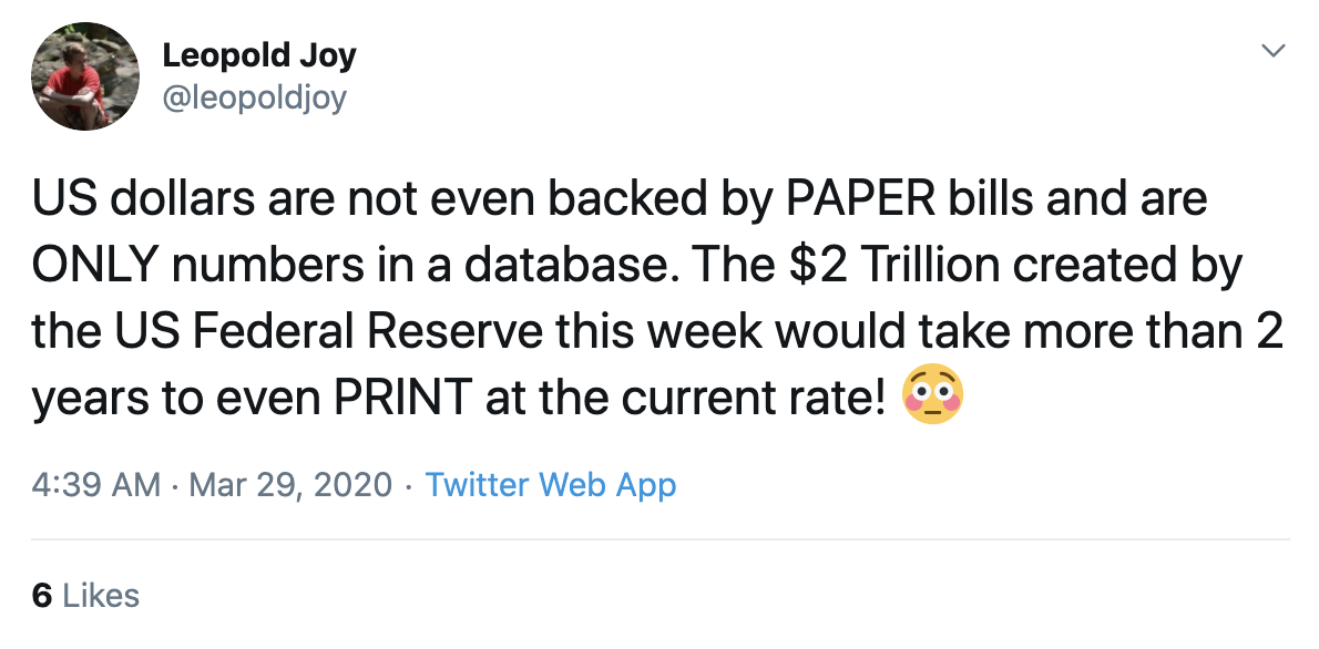 Alguém poderia pensar que o Federal Reserve está, pelo menos, apoiando seus dólares com papel-moeda real, mas a matemática não dá certo. Segundo um usuário, levaria muito tempo para que isso fosse possível.