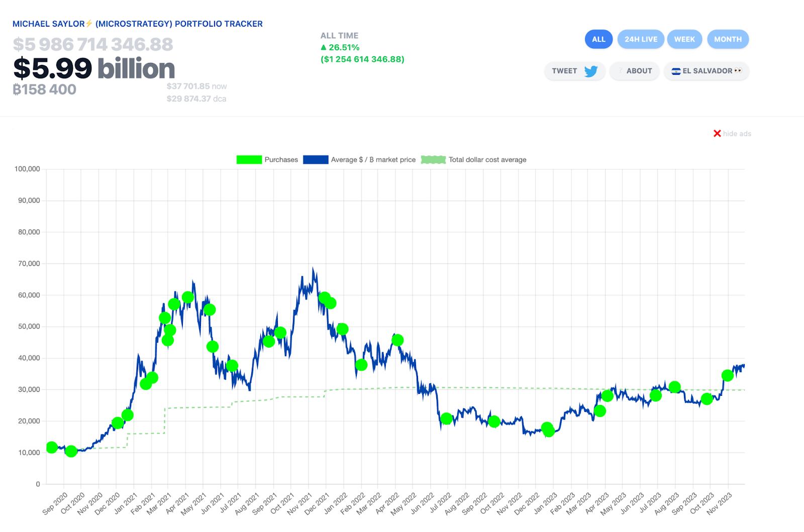 Saylor, o fundador da MicroStrategy, anunciou que a empresa adquiriu 16.130 BTC a um custo médio de US$ 36.785 por Bitcoin. No total, a empresa investiu aproximadamente US$ 593,3 milhões na compra de Bitcoin durante novembro de 2023.