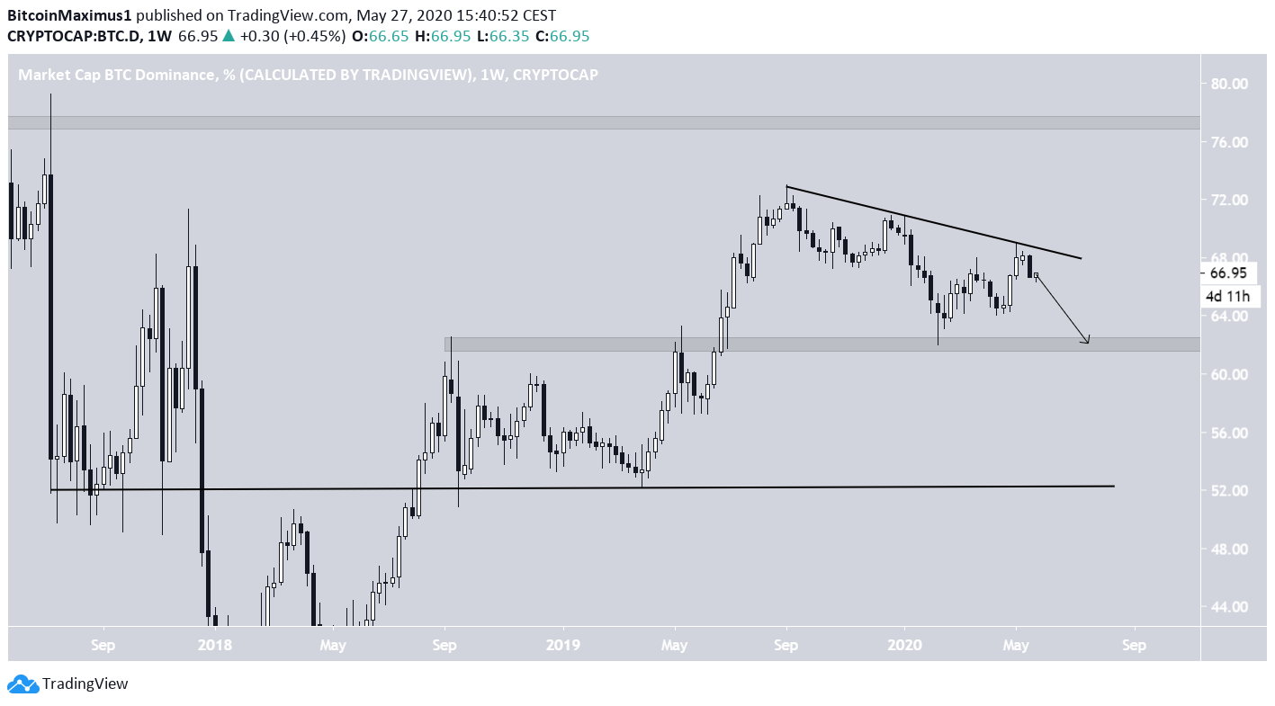 O BTCD segue uma linha de resistência descendente desde setembro de 2019. Até agora, o preço a atingiu três vezes, criando três máximas mais baixas.