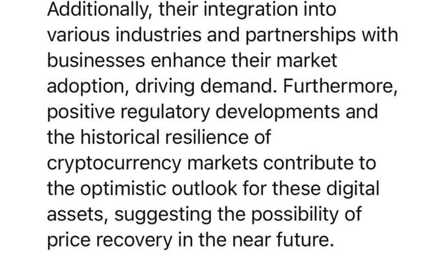 Além disso, sua integração em vários setores e parcerias com empresas aumentam sua adoção no mercado, impulsionando a demanda. Além disso, os desenvolvimentos regulatórios positivos e a resiliência histórica dos mercados de criptomoedas contribuem para a perspectiva otimista desses ativos digitais, sugerindo a possibilidade de recuperação dos preços em um futuro próximo.