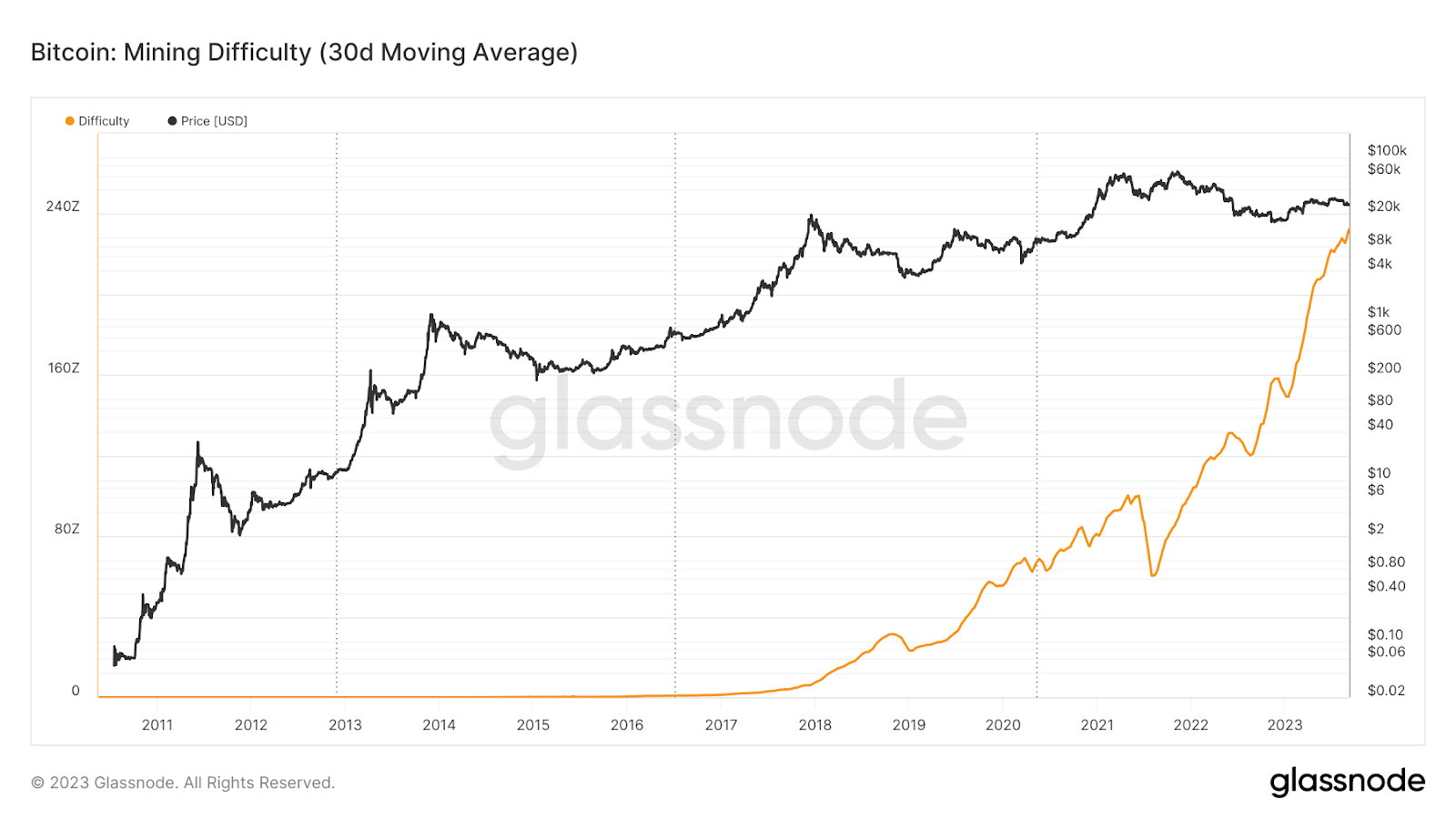 A análise on-chain mostra que, de fato, tanto a taxa de hash da rede Bitcoin quanto a dificuldade de mineração de blocos sucessivos estão hoje em níveis máximos.