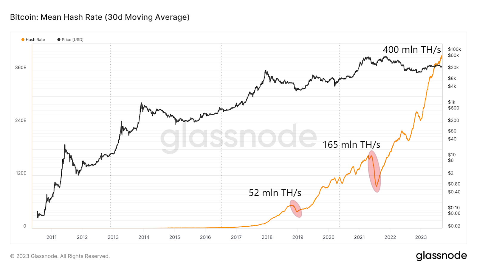Além disso, podem ser observadas correções periódicas, como no final do mercado baixista em 2018 ou durante a famosa proibição da China no verão de 2021 (áreas vermelhas). Neste último caso, a taxa de hash caiu quase 50%, de 165 TH/s para 96 TH/s.