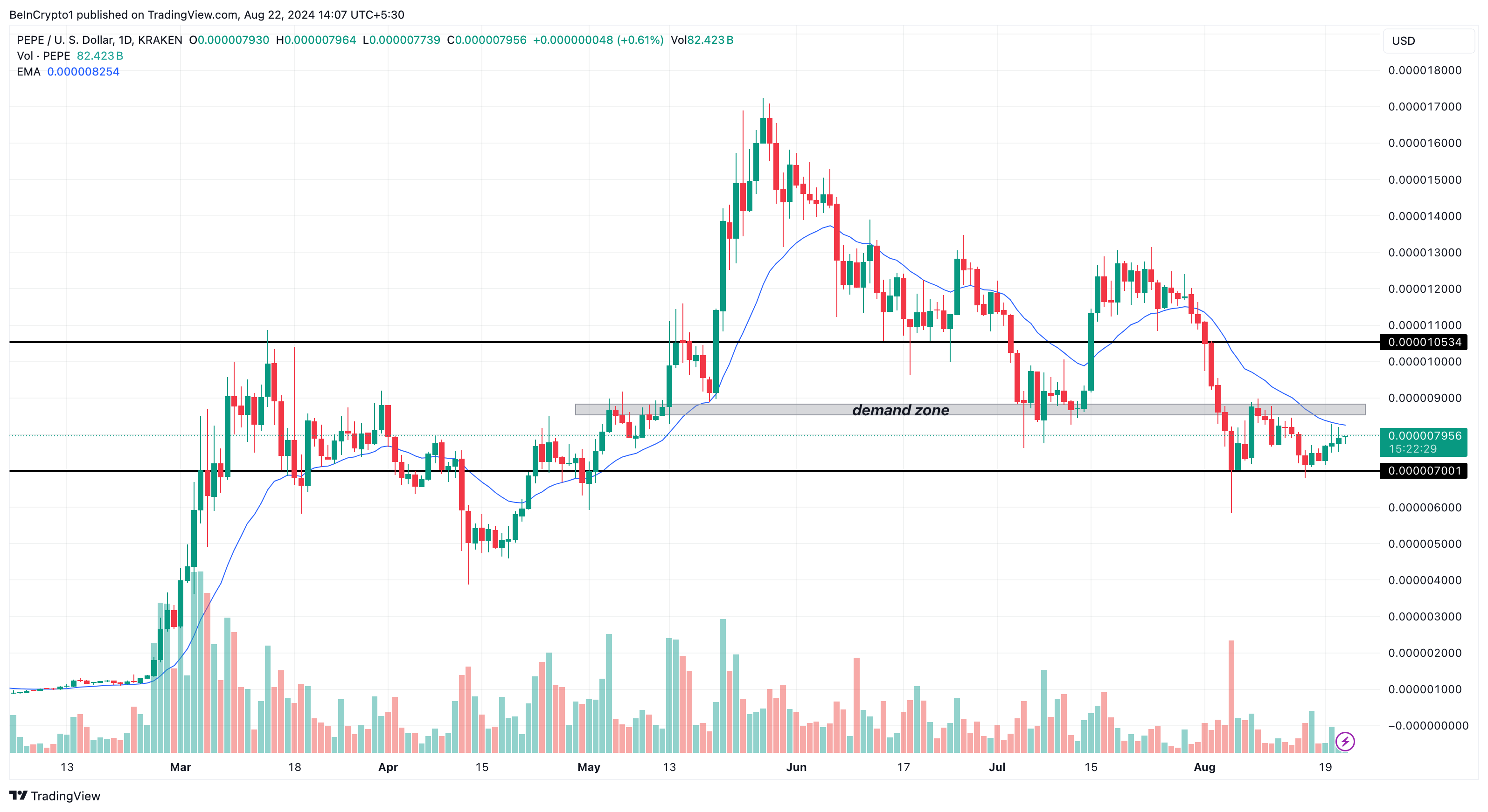 A EMA mede a direção da tendência, e o preço estar abaixo do indicador é um sinal de baixa. Se isso permanecer assim, o preço de PEPE pode retrair para US$ 0,0000070 novamente. No entanto, um rompimento acima do indicador poderia invalidar essa tese. Se isso acontecer, o preço pode aumentar.