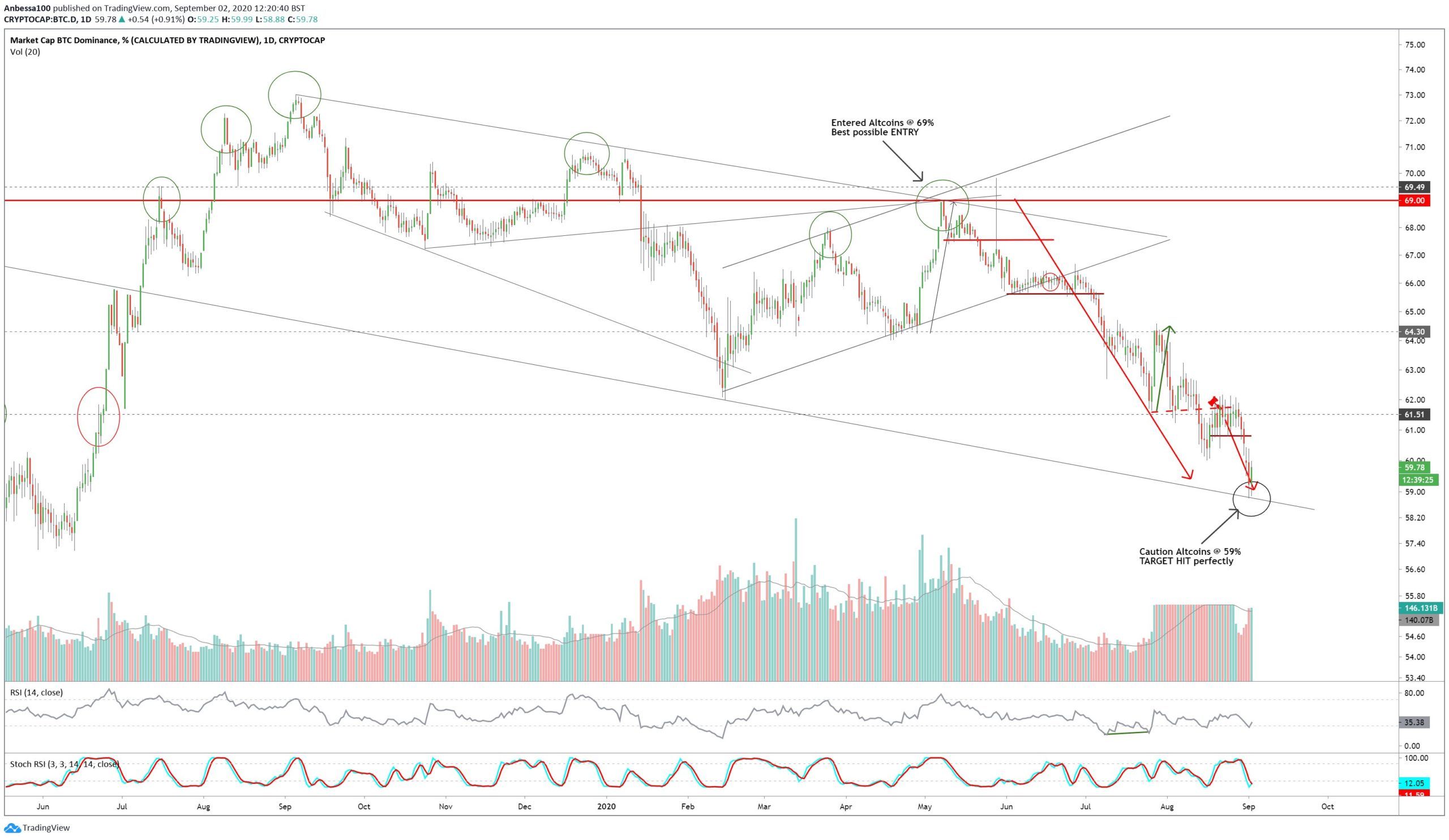 A trader de criptomoeda @Anbessa100 postou um gráfico da dominância do Bitcoin que mostra que o preço atingiu a área de 59 % . Ela prevê um salto, o que significaria uma queda das altcoins. Desde o tweet, o BTCD saltou de sua mínima de 59% e atingiu a área de 61%.