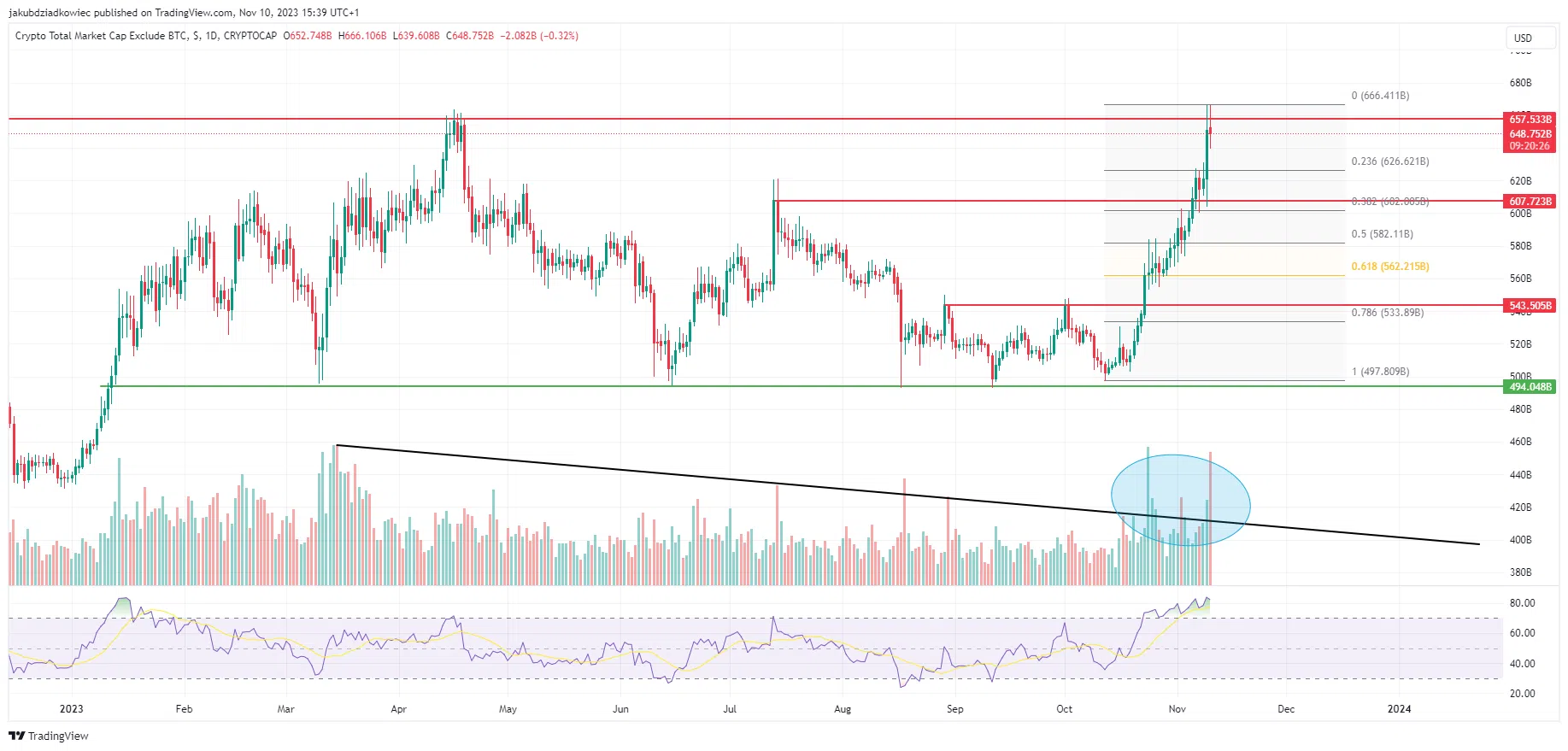 O indicador do TOTAL2 está hoje no seu nível mais alto desde novembro de 2021. Isto confirma ainda mais a mudança no sentimento do mercado e o potencial início da temporada de altcoins.